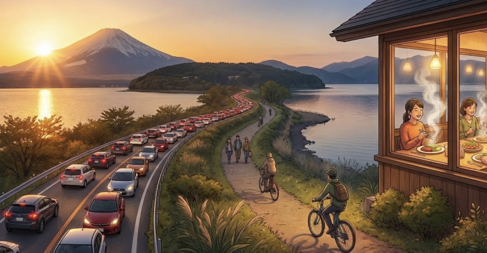 - 16:30 帰路の渋滞ピーク。無理に脱出しようとせず、近くの飲食店で19時以降まで時間を潰すのが、賢い大人の選択です。